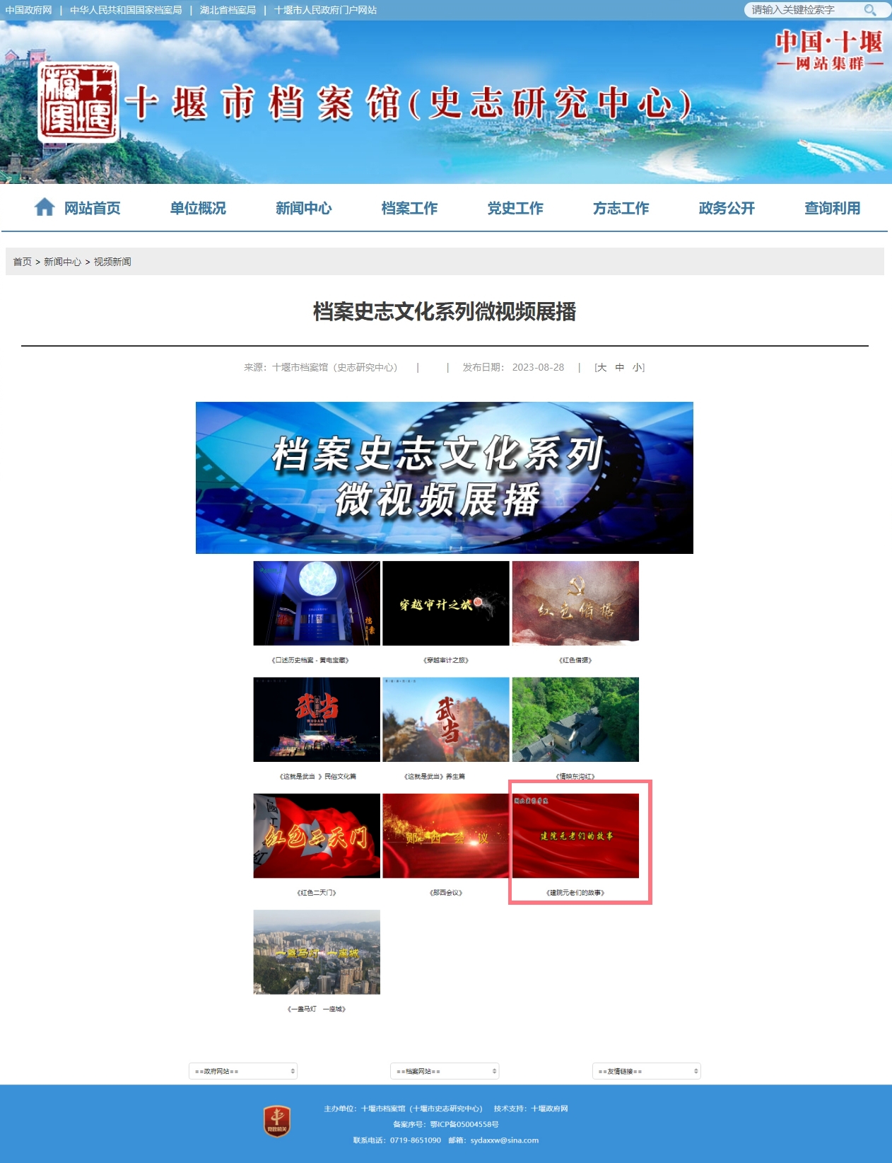 本网讯(通讯员 孟旸)近日,为庆祝第十七个“6·9”国际档案日,十堰市档案局、档案馆在十堰市档案馆网站、“十堰档案”微信公众号展播档案史志文化微视频,我校档案馆、校史馆报送的微视频《建院元老们的故事》被选中展播。