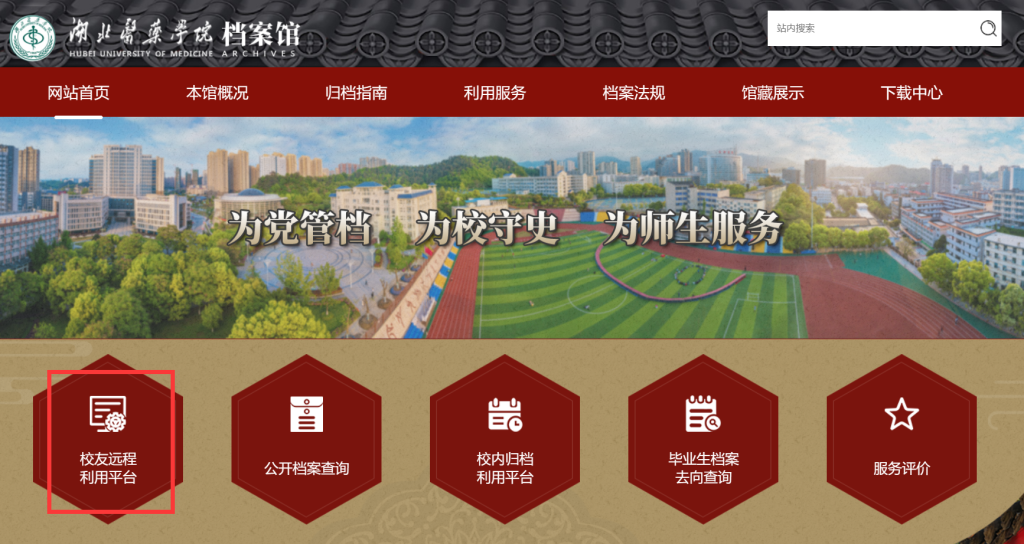 1、搜索“湖北医药学院档案馆” 2、进入网站首页,点击“校友远程利用平台”,进行注册,并提交校友身份验证材料。 3、提交查档申请,并勾选取件方式“快递”或“上门自取”,其中上门自取时间仅限于每周三上午9:30—11:00; 4、寒假期间,值班老师每周三上午处理查档申请。申请人可以再次登录“校友远程利用平台”点击右上“消息”或者“我的申请”查看审批意见、当前进度及快递单号。校友若有疑问,可以在系统中“...